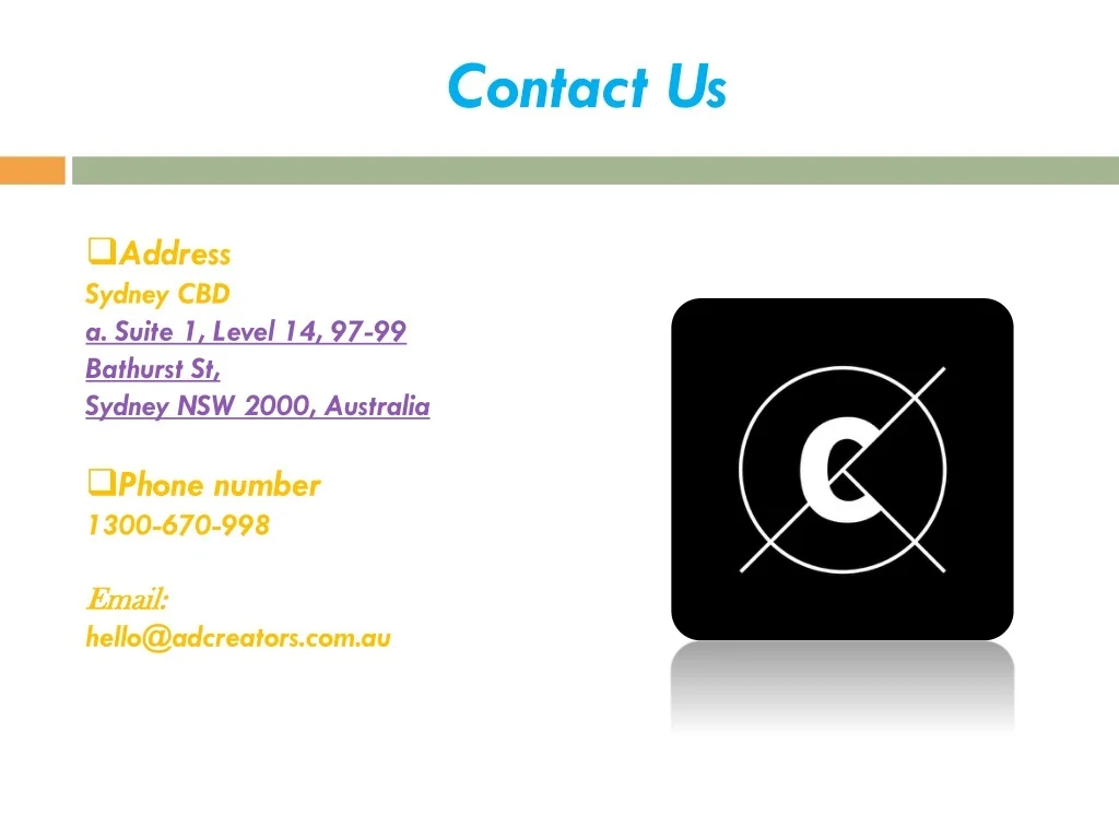Contact Us • Address • Sydney CBD • a. Suite 1, Level 14, 97-99 Bathurst St,Sydney NSW 2000, Australia • Phone number • 1300-670-998 • Email: • hello@adcreators.com.au