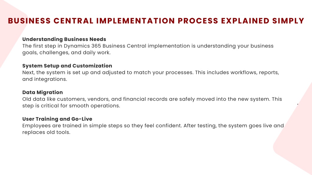 3. WHAT IS DYNAMICS 365 BUSINESS CENTRAL Microsoft Dynamics 365 Business Central is a cloud-based business management system made for small and medium- sized companies. It helps manage daily tasks like accounting, purchasing, sales, inventory, and reporting from one platform. With the right Dynamics 365 Business Central implementation, businesses can connect teams, automate work, and get clear insights without using many different tools. WHY DYNAMICS 365 BUSINESS CENTRAL IMPLEMENTATION MATTERS A proper Dynamics 365 Business Central implementation is very important. It ensures the system fits your business needs and works smoothly from day one. A well-planned setup saves time, avoids errors, and helps users adapt easily. When done correctly, implementation helps improve business central ROI, which means you get more value from your investment over time.