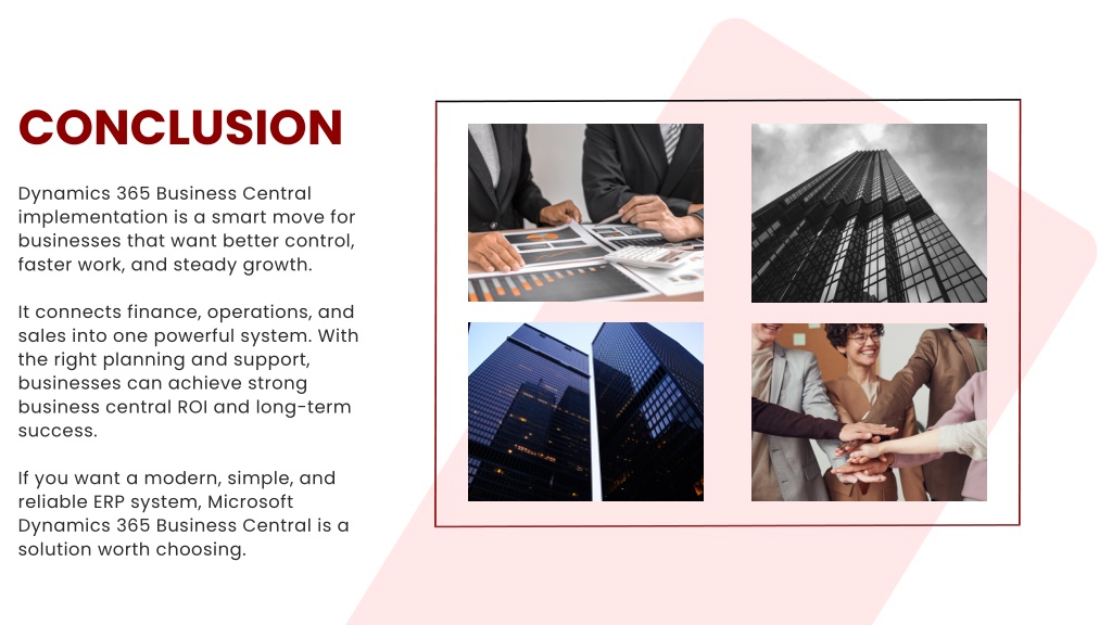 6. CONCLUSION Dynamics 365 Business Central implementation is a smart move for businesses that want better control, faster work, and steady growth. It connects finance, operations, and sales into one powerful system. With the right planning and support, businesses can achieve strong business central ROI and long-term success. If you want a modern, simple, and reliable ERP system, Microsoft Dynamics 365 Business Central is a solution worth choosing.