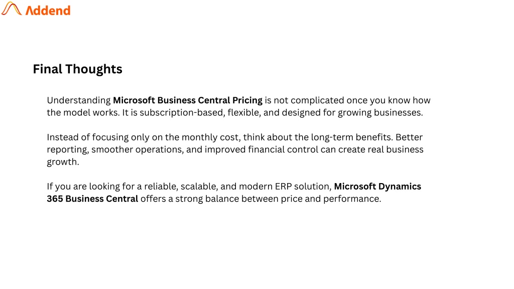 Final Thoughts Understanding Microsoft Business Central Pricing is not complicated once you know how the model works. It is subscription-based, flexible, and designed for growing businesses. Instead of focusing only on the monthly cost, think about the long-term benefits. Better reporting, smoother operations, and improved financial control can create real business growth. If you are looking for a reliable, scalable, and modern ERP solution, Microsoft Dynamics 365 Business Central offers a strong balance between price and performance.