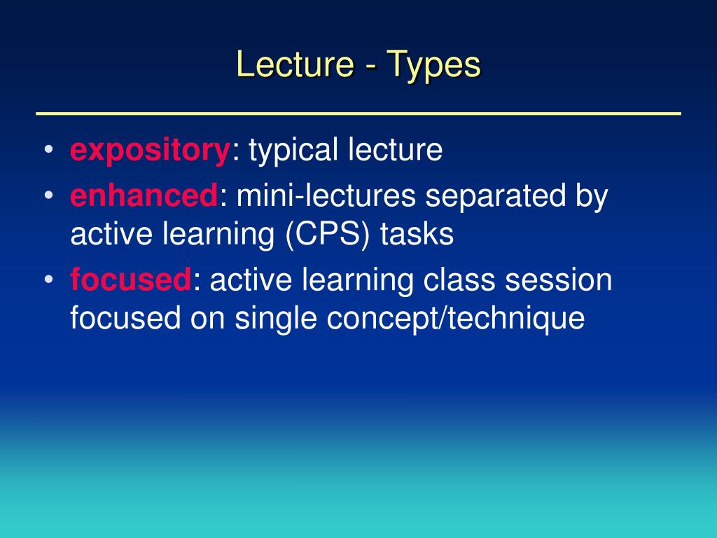 Lecture - Types • expository: typical lecture • enhanced: mini-lectures separated by active learning (CPS) tasks • focused: active learning class session focused on single concept/technique