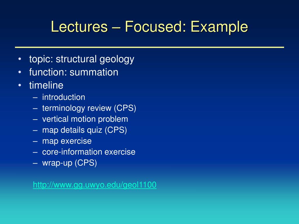Lectures – Focused: Example • topic: structural geology • function: summation • timeline • introduction • terminology review (CPS) • vertical motion problem • map details quiz (CPS) • map exercise • core-information exercise • wrap-up (CPS) http://www.gg.uwyo.edu/geol1100