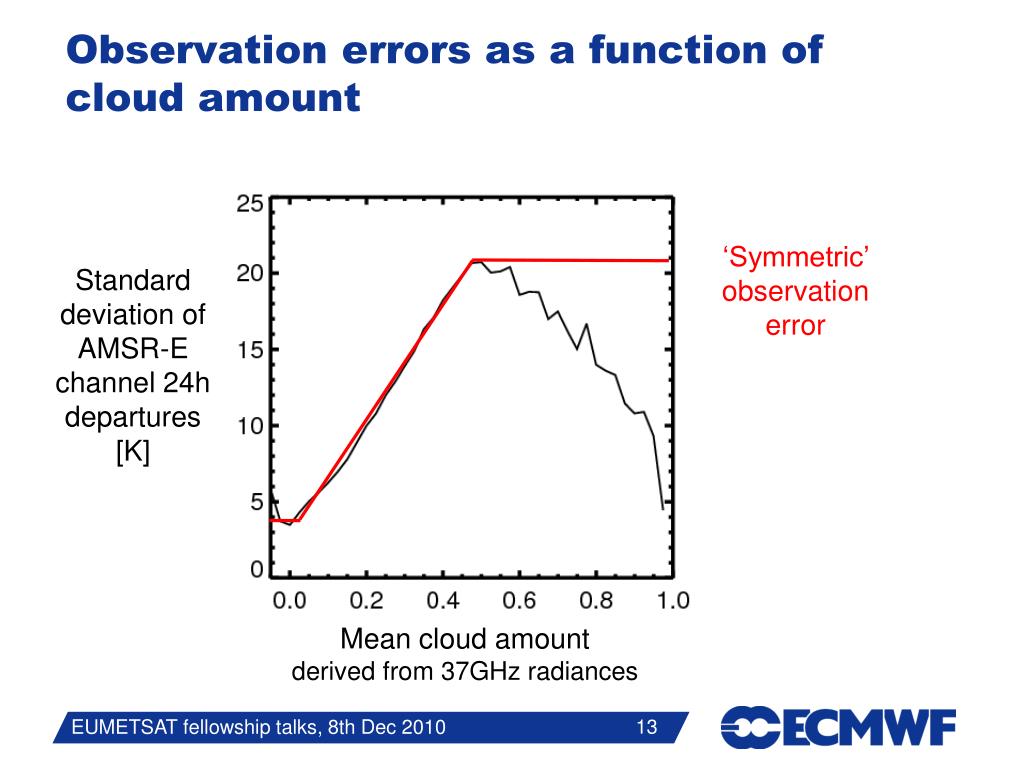 Observation errors as a function of cloud amount ‘Symmetric’ observation error Standard deviation of AMSR-E channel 24hdepartures [K] • Mean cloud amount • derived from 37GHz radiances EUMETSAT fellowship talks, 8th Dec 2010