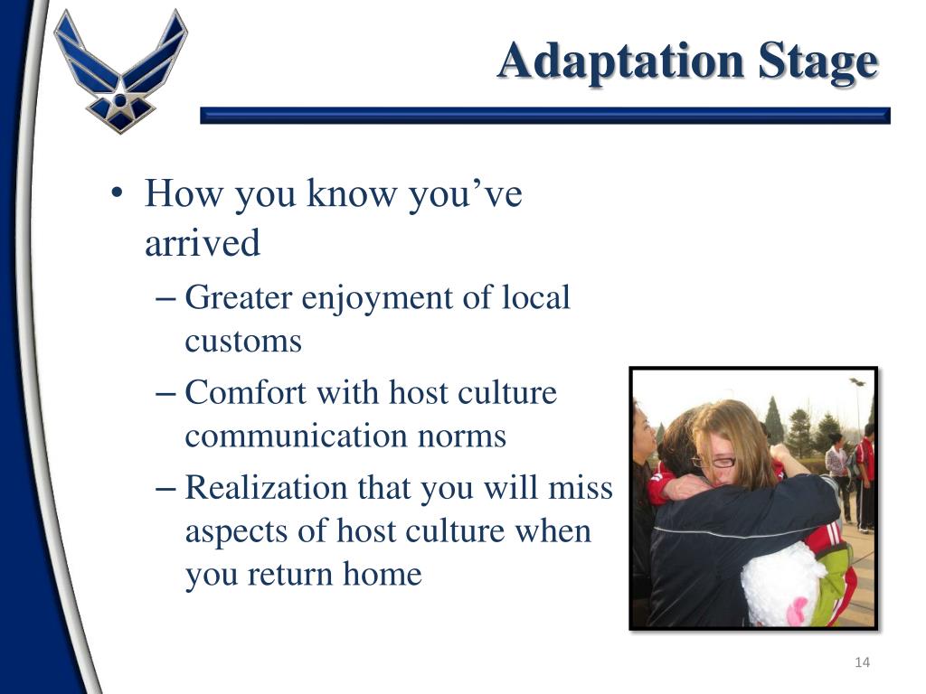 Adaptation Stage • How you know you’ve arrived • Greater enjoyment of local customs • Comfort with host culture communication norms • Realization that you will miss aspects of host culture when you return home