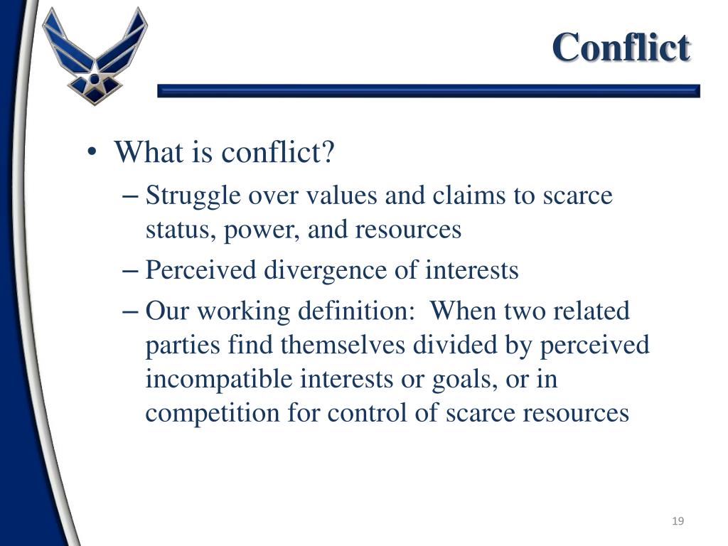 Conflict • What is conflict? • Struggle over values and claims to scarce status, power, and resources • Perceived divergence of interests • Our working definition: When two related parties find themselves divided by perceived incompatible interests or goals, or in competition for control of scarce resources