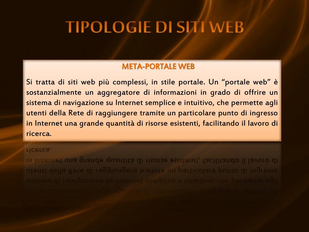 TIPOLOGIE DI SITI WEB META-PORTALE WEB Si tratta di siti web più complessi, in stile portale. Un “portale web” è sostanzialmente un aggregatore di informazioni in grado di offrire un sistema di navigazione su Internet semplice e intuitivo, che permette agli utenti della Rete di raggiungere tramite un particolare punto di ingresso in Internet una grande quantità di risorse esistenti, facilitando il lavoro di ricerca.