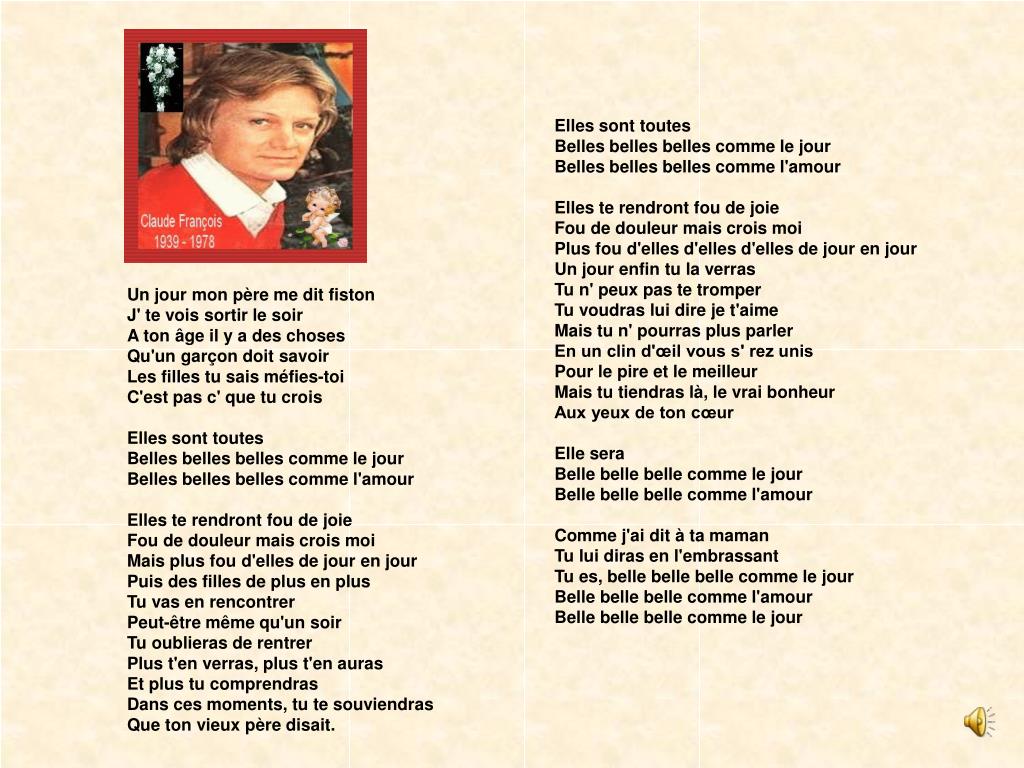 Elles sont toutesBelles belles belles comme le jourBelles belles belles comme l'amourElles te rendront fou de joieFou de douleur mais crois moiPlus fou d'elles d'elles d'elles de jour en jourUn jour enfin tu la verrasTu n' peux pas te tromperTu voudras lui dire je t'aimeMais tu n' pourras plus parlerEn un clin d'œil vous s' rez unisPour le pire et le meilleurMais tu tiendras là, le vrai bonheurAux yeux de ton cœurElle seraBelle belle belle comme le jourBelle belle belle comme l'amourComme j'ai dit à ta mamanTu lui diras en l'embrassantTu es, belle belle belle comme le jourBelle belle belle comme l'amourBelle belle belle comme le jour Un jour mon père me dit fistonJ' te vois sortir le soirA ton âge il y a des chosesQu'un garçon doit savoirLes filles tu sais méfies-toiC'est pas c' que tu croisElles sont toutesBelles belles belles comme le jourBelles belles belles comme l'amour Elles te rendront fou de joieFou de douleur mais crois moiMais plus fou d'elles de jour en jourPuis des filles de plus en plusTu vas en rencontrerPeut-être même qu'un soirTu oublieras de rentrerPlus t'en verras, plus t'en aurasEt plus tu comprendrasDans ces moments, tu te souviendrasQue ton vieux père disait.