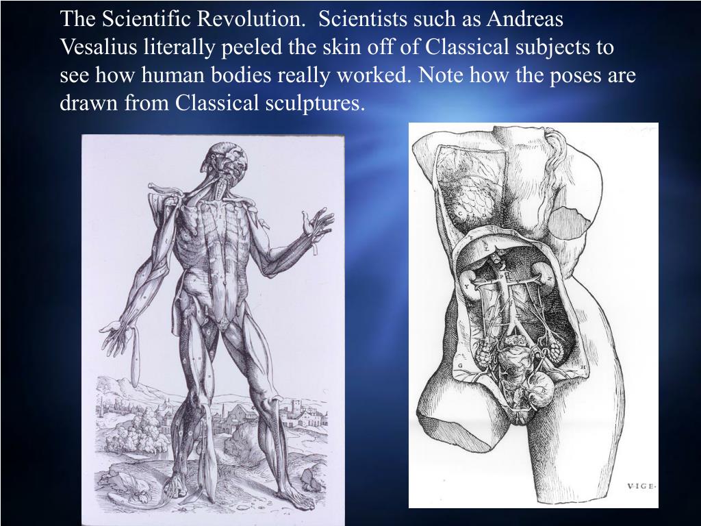 The Scientific Revolution. Scientists such as Andreas Vesalius literally peeled the skin off of Classical subjects to see how human bodies really worked. Note how the poses are drawn from Classical sculptures.