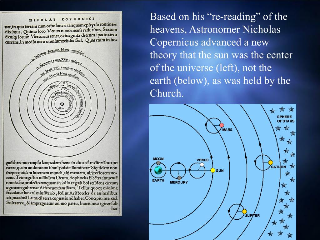 Based on his “re-reading” of the heavens, Astronomer Nicholas Copernicus advanced a new theory that the sun was the center of the universe (left), not the earth (below), as was held by the Church.