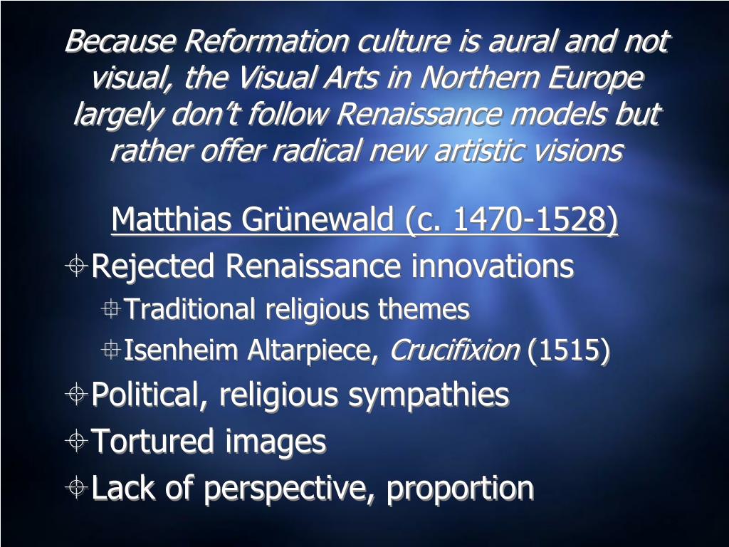 Because Reformation culture is aural and not visual, the Visual Arts in Northern Europe largely don’t follow Renaissance models but rather offer radical new artistic visions Matthias Grünewald (c. 1470-1528) • Rejected Renaissance innovations • Traditional religious themes • Isenheim Altarpiece, Crucifixion (1515) • Political, religious sympathies • Tortured images • Lack of perspective, proportion
