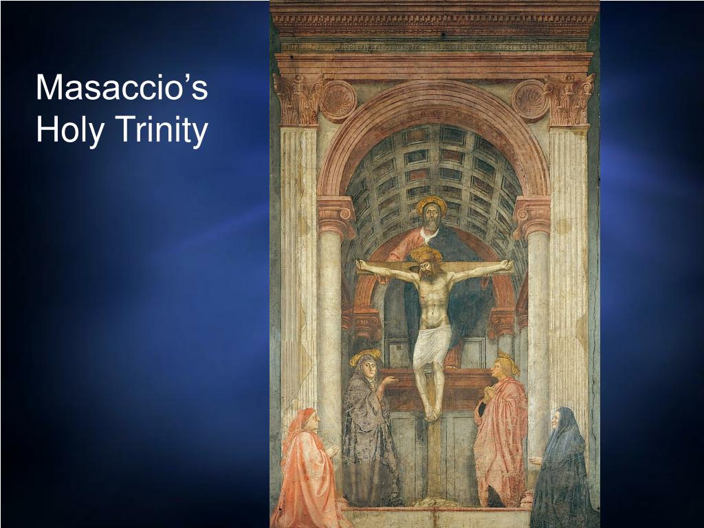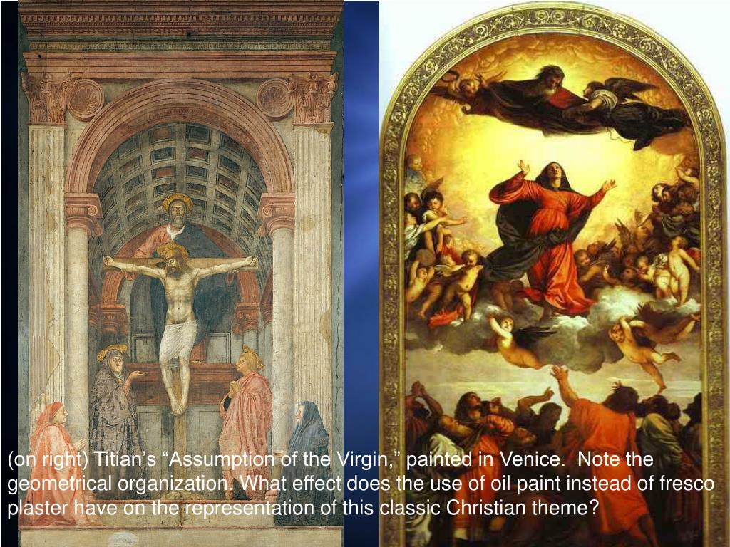 (on right) Titian’s “Assumption of the Virgin,” painted in Venice. Note the geometrical organization. What effect does the use of oil paint instead of fresco plaster have on the representation of this classic Christian theme?