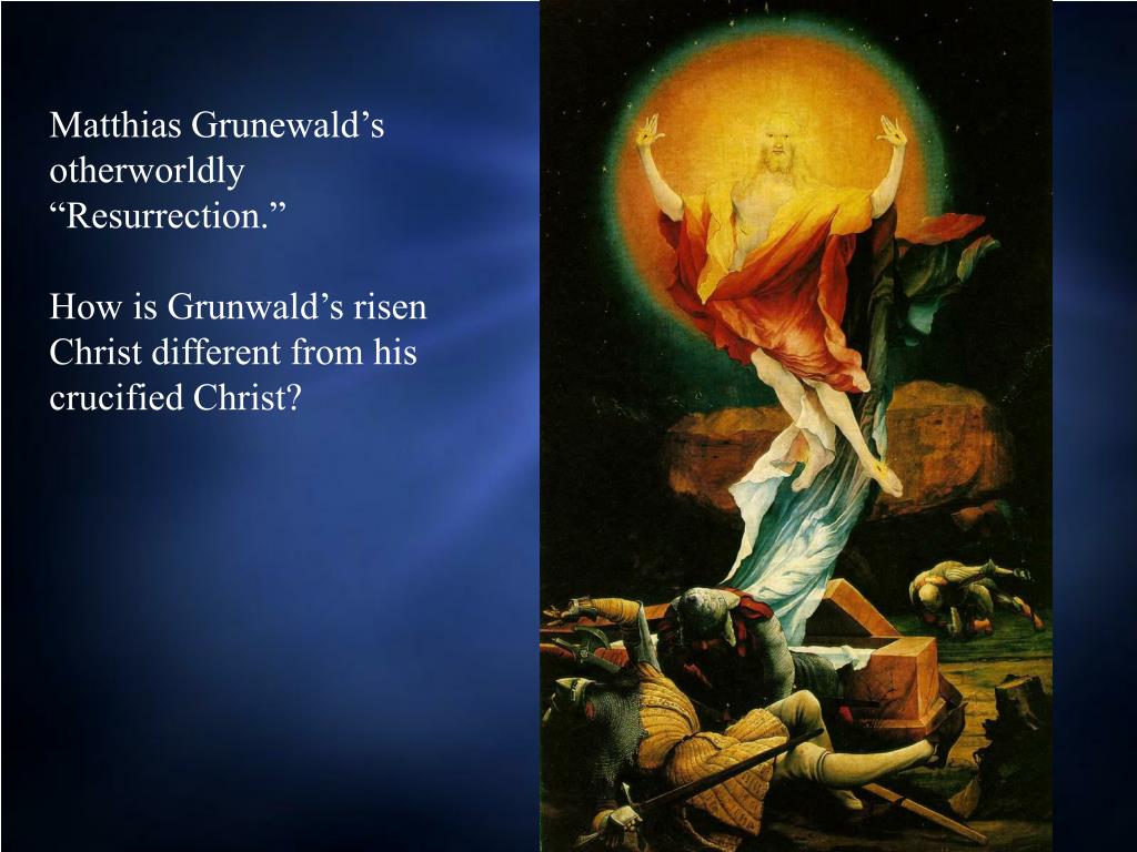 Matthias Grunewald’s otherworldly “Resurrection.” How is Grunwald’s risen Christ different from his crucified Christ?
