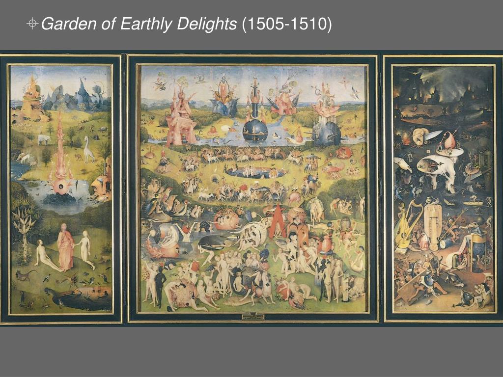 Painting in the Netherlands Hieronymus Bosch (c. 1450-1516) • Pessimistic view of human nature • Human folly • Inevitable punishment for sin • Garden of Earthly Delights (1505-1510) • Pleasures of the body lead to damnation • Private and complex symbolism