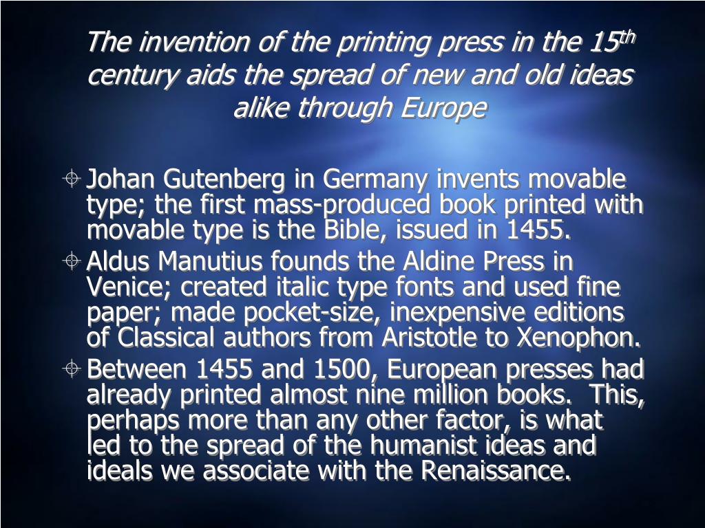 The invention of the printing press in the 15th century aids the spread of new and old ideas alike through Europe • Johan Gutenberg in Germany invents movable type; the first mass-produced book printed with movable type is the Bible, issued in 1455. • Aldus Manutius founds the Aldine Press in Venice; created italic type fonts and used fine paper; made pocket-size, inexpensive editions of Classical authors from Aristotle to Xenophon. • Between 1455 and 1500, European presses had already printed almost nine million books. This, perhaps more than any other factor, is what led to the spread of the humanist ideas and ideals we associate with the Renaissance.