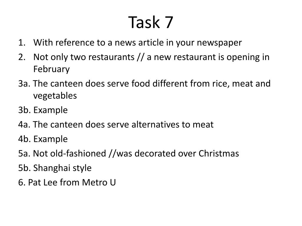 Task 7 • With reference to a news article in your newspaper • Not only two restaurants // a new restaurant is opening in February 3a. The canteen does serve food different from rice, meat and vegetables 3b. Example 4a. The canteen does serve alternatives to meat 4b. Example 5a. Not old-fashioned //was decorated over Christmas 5b. Shanghai style 6. Pat Lee from Metro U