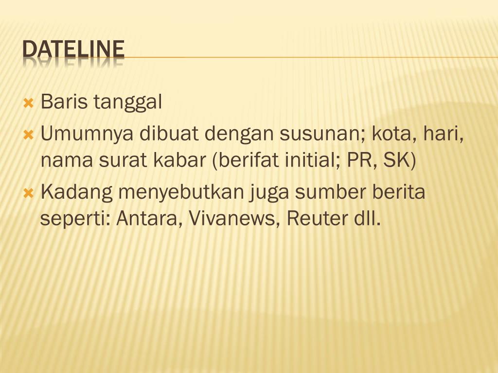 Baristanggal Umumnyadibuatdengansusunan; kota, hari, namasuratkabar(berifat initial; PR, SK) Kadangmenyebutkanjugasumberberitaseperti: Antara, Vivanews, Reuter dll. dateline