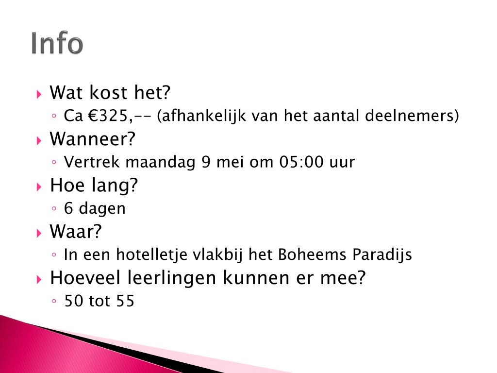 Info • Wat kost het? • Ca €325,-- (afhankelijk van het aantal deelnemers) • Wanneer? • Vertrek maandag 9 mei om 05:00 uur • Hoe lang? • 6 dagen • Waar? • In een hotelletje vlakbij het Boheems Paradijs • Hoeveel leerlingen kunnen er mee? • 50 tot 55