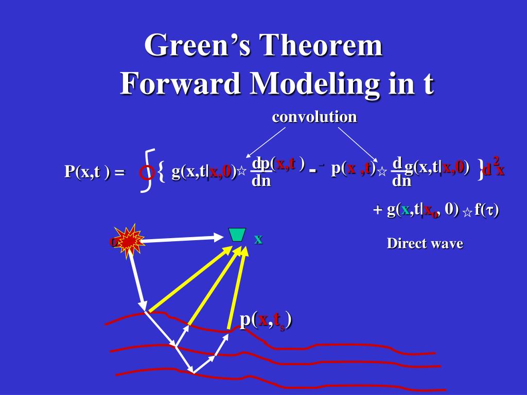 convolution f(t) p(x,t ) s Direct wave + g(x,t|x , 0) o x o d d dn dn Green’s Theorem Forward Modeling in t - } 2 p(x,t ) - d x g(x,t|x,0) p(x ,t) g(x,t|x,0) P(x,t ) = }