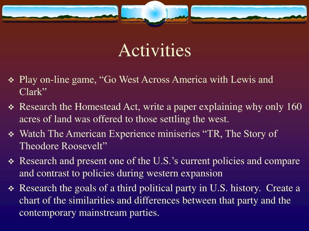 Activities • Play on-line game, “Go West Across America with Lewis and Clark” • Research the Homestead Act, write a paper explaining why only 160 acres of land was offered to those settling the west. • Watch The American Experience miniseries “TR, The Story of Theodore Roosevelt” • Research and present one of the U.S.’s current policies and compare and contrast to policies during western expansion • Research the goals of a third political party in U.S. history. Create a chart of the similarities and differences between that party and the contemporary mainstream parties.