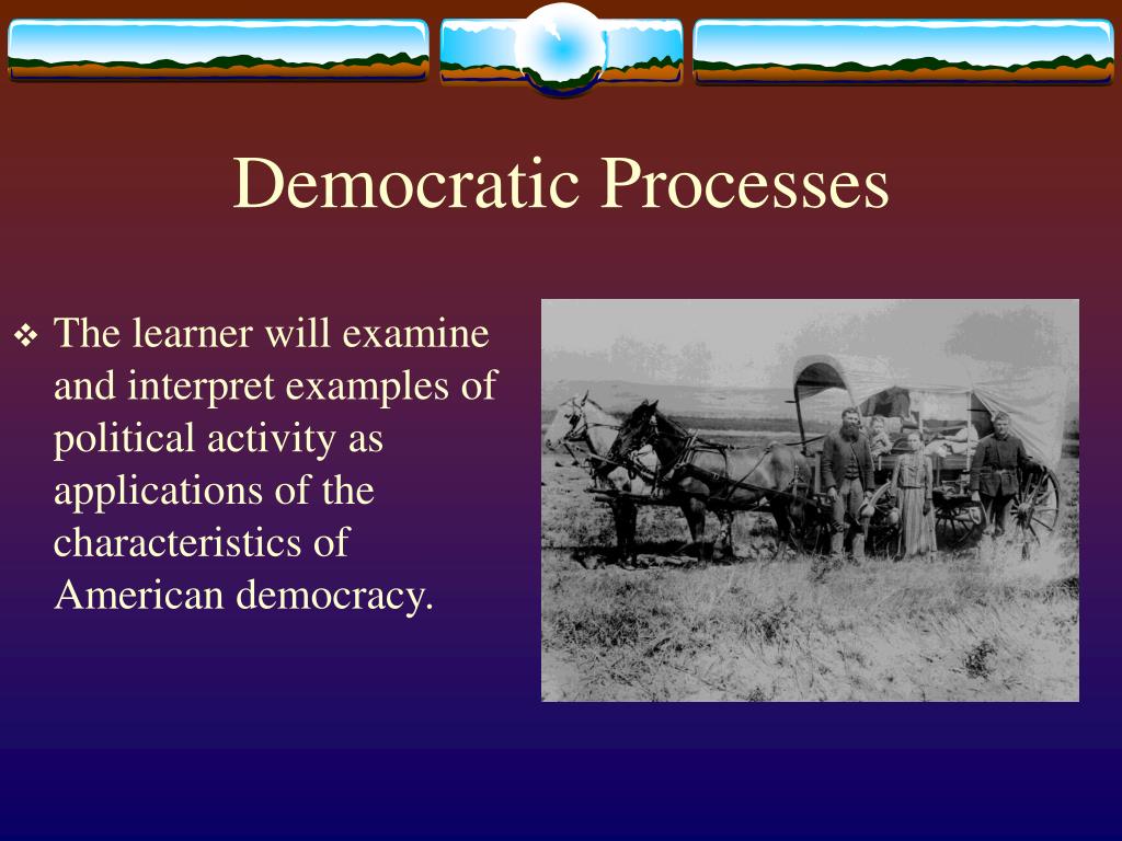 Democratic Processes • The learner will examine and interpret examples of political activity as applications of the characteristics of American democracy.