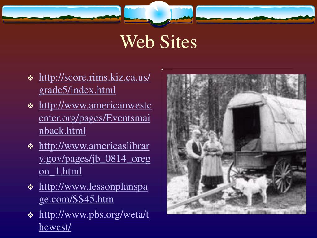 Web Sites • http://score.rims.kiz.ca.us/grade5/index.html • http://www.americanwestcenter.org/pages/Eventsmainback.html • http://www.americaslibrary.gov/pages/jb_0814_oregon_1.html • http://www.lessonplanspage.com/SS45.htm • http://www.pbs.org/weta/thewest/