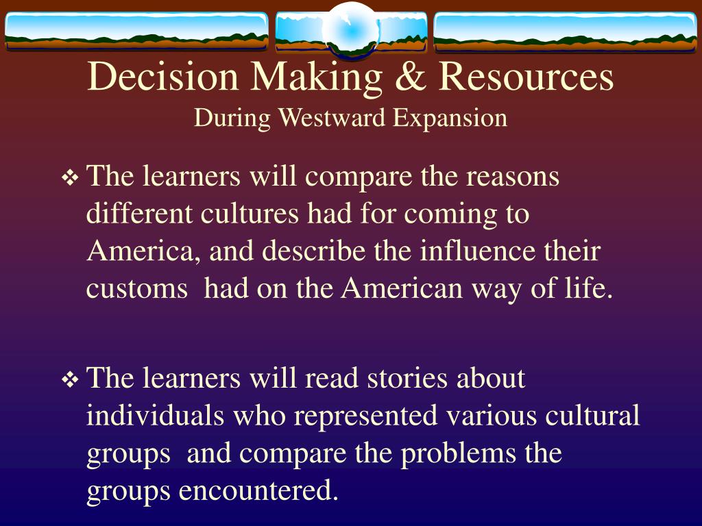 Decision Making & ResourcesDuring Westward Expansion • The learners will compare the reasons different cultures had for coming to America, and describe the influence their customs had on the American way of life. • The learners will read stories about individuals who represented various cultural groups and compare the problems the groups encountered.