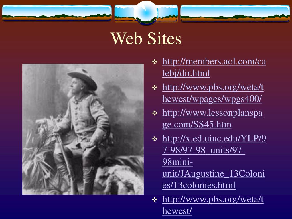 Web Sites • http://www.nps.gov/jeff/mus-our.htm • http://www.geocities.com/Athens/Academy/6617/west.html • http://www.connectingstudents.com/themes/west.htm • http://www.nationalgeographic.com/features/97/west/ • http://tess.uis.edu/www/448sp99/westward.html