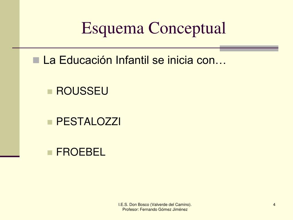 Esquema Conceptual • La Educación Infantil se inicia con… • ROUSSEU • PESTALOZZI • FROEBEL I.E.S. Don Bosco (Valverde del Camino). Profesor: Fernando Gómez Jiménez