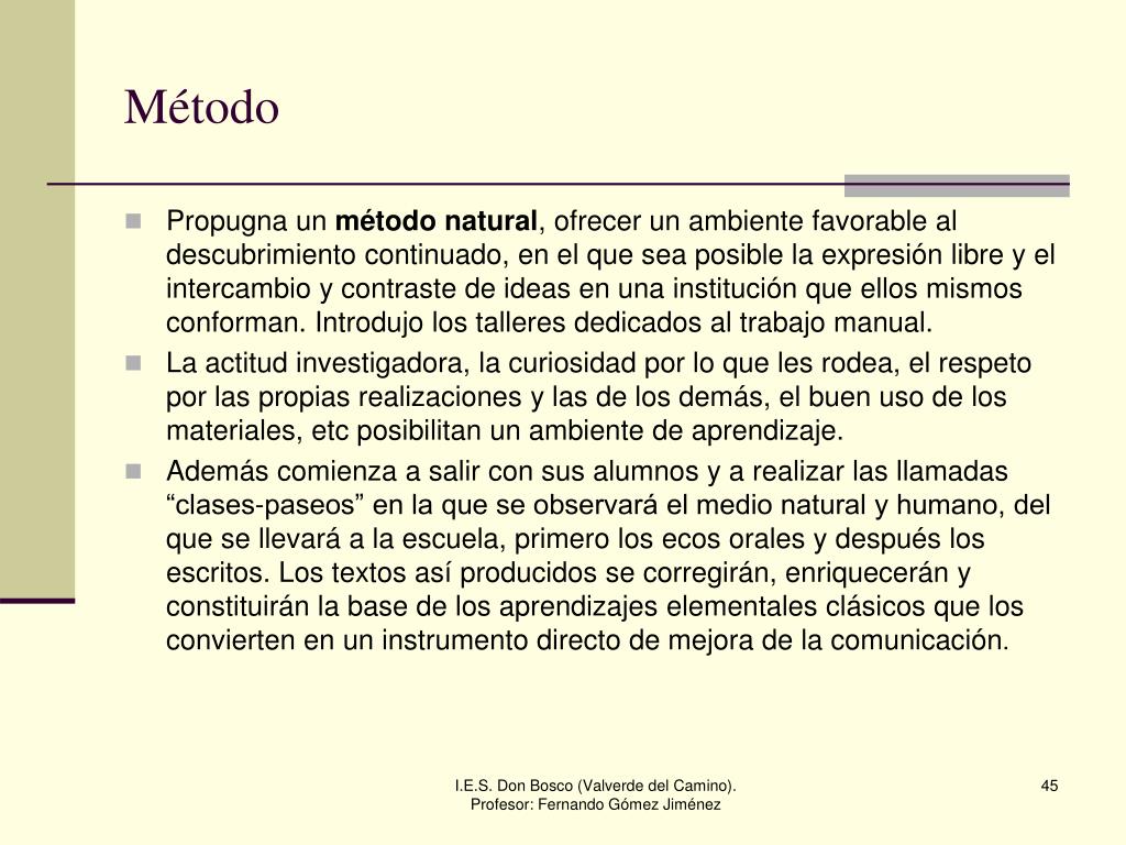Método • Propugna un método natural, ofrecer un ambiente favorable al descubrimiento continuado, en el que sea posible la expresión libre y el intercambio y contraste de ideas en una institución que ellos mismos conforman. Introdujo los talleres dedicados al trabajo manual. • La actitud investigadora, la curiosidad por lo que les rodea, el respeto por las propias realizaciones y las de los demás, el buen uso de los materiales, etc posibilitan un ambiente de aprendizaje. • Además comienza a salir con sus alumnos y a realizar las llamadas “clases-paseos” en la que se observará el medio natural y humano, del que se llevará a la escuela, primero los ecos orales y después los escritos. Los textos así producidos se corregirán, enriquecerán y constituirán la base de los aprendizajes elementales clásicos que los convierten en un instrumento directo de mejora de la comunicación. I.E.S. Don Bosco (Valverde del Camino). Profesor: Fernando Gómez Jiménez