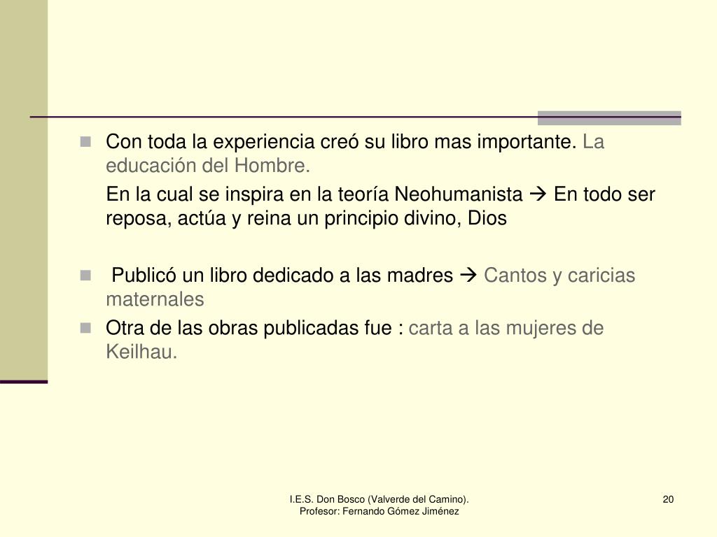 Con toda la experiencia creó su libro mas importante. La educación del Hombre. En la cual se inspira en la teoría Neohumanista En todo ser reposa, actúa y reina un principio divino, Dios • Publicó un libro dedicado a las madres Cantos y caricias maternales • Otra de las obras publicadas fue : carta a las mujeres de Keilhau. I.E.S. Don Bosco (Valverde del Camino). Profesor: Fernando Gómez Jiménez