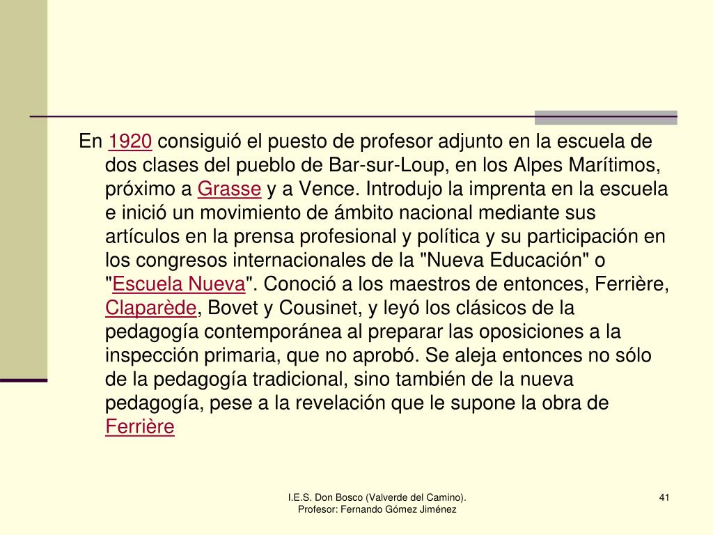 En 1920 consiguió el puesto de profesor adjunto en la escuela de dos clases del pueblo de Bar-sur-Loup, en los Alpes Marítimos, próximo a Grasse y a Vence. Introdujo la imprenta en la escuela e inició un movimiento de ámbito nacional mediante sus artículos en la prensa profesional y política y su participación en los congresos internacionales de la "Nueva Educación" o "Escuela Nueva". Conoció a los maestros de entonces, Ferrière, Claparède, Bovet y Cousinet, y leyó los clásicos de la pedagogía contemporánea al preparar las oposiciones a la inspección primaria, que no aprobó. Se aleja entonces no sólo de la pedagogía tradicional, sino también de la nueva pedagogía, pese a la revelación que le supone la obra de Ferrière I.E.S. Don Bosco (Valverde del Camino). Profesor: Fernando Gómez Jiménez