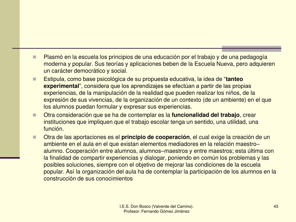 Plasmó en la escuela los principios de una educación por el trabajo y de una pedagogía moderna y popular. Sus teorías y aplicaciones beben de la Escuela Nueva, pero adquieren un carácter democrático y social. • Estipula, como base psicológica de su propuesta educativa, la idea de “tanteo experimental”, considera que los aprendizajes se efectúan a partir de las propias experiencias, de la manipulación de la realidad que pueden realizar los niños, de la expresión de sus vivencias, de la organización de un contexto (de un ambiente) en el que los alumnos puedan formular y expresar sus experiencias. • Otra consideración que se ha de contemplar es la funcionalidad del trabajo, crear instituciones que impliquen que el trabajo escolar tenga un sentido, una utilidad, una función. • Otra de las aportaciones es el principio de cooperación, el cual exige la creación de un ambiente en el aula en el que existan elementos mediadores en la relación maestro–alumno. Cooperación entre alumnos, alumnos–maestros y entre maestros; esta última con la finalidad de compartir experiencias y dialogar, poniendo en común los problemas y las posibles soluciones, siempre con el objetivo de mejorar las condiciones de la escuela popular. Así la organización del aula ha de contemplar la participación de los alumnos en la construcción de sus conocimientos I.E.S. Don Bosco (Valverde del Camino). Profesor: Fernando Gómez Jiménez