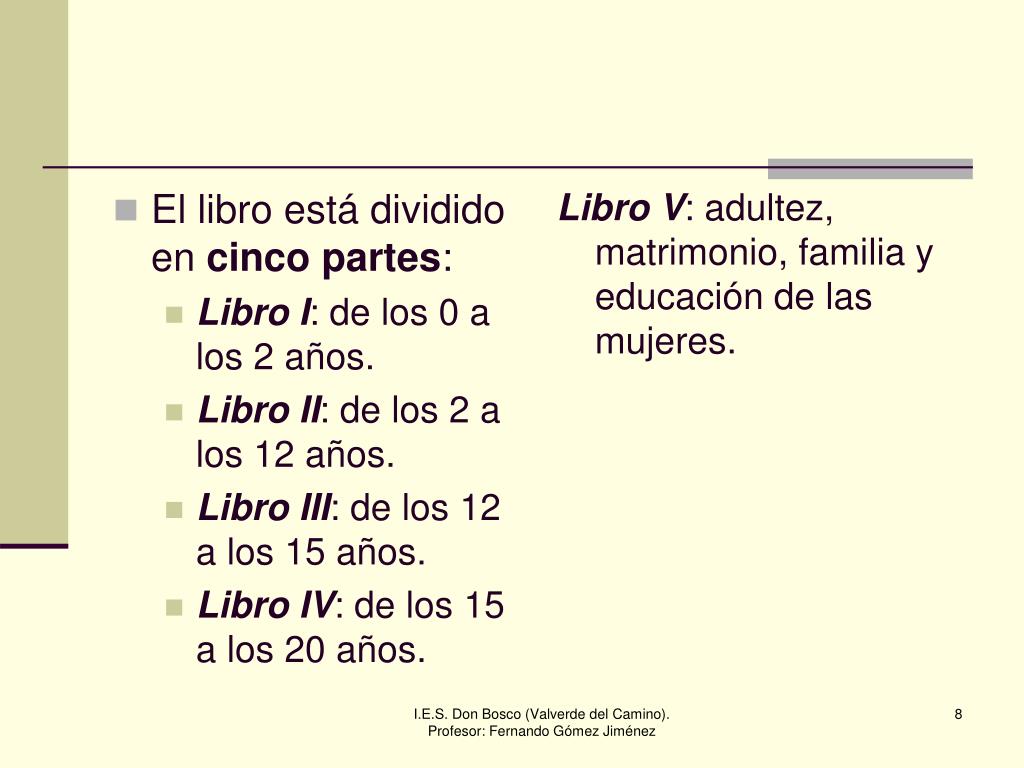 El libro está dividido en cinco partes: • Libro I: de los 0 a los 2 años. • Libro II: de los 2 a los 12 años. • Libro III: de los 12 a los 15 años. • Libro IV: de los 15 a los 20 años. Libro V: adultez, matrimonio, familia y educación de las mujeres. I.E.S. Don Bosco (Valverde del Camino). Profesor: Fernando Gómez Jiménez