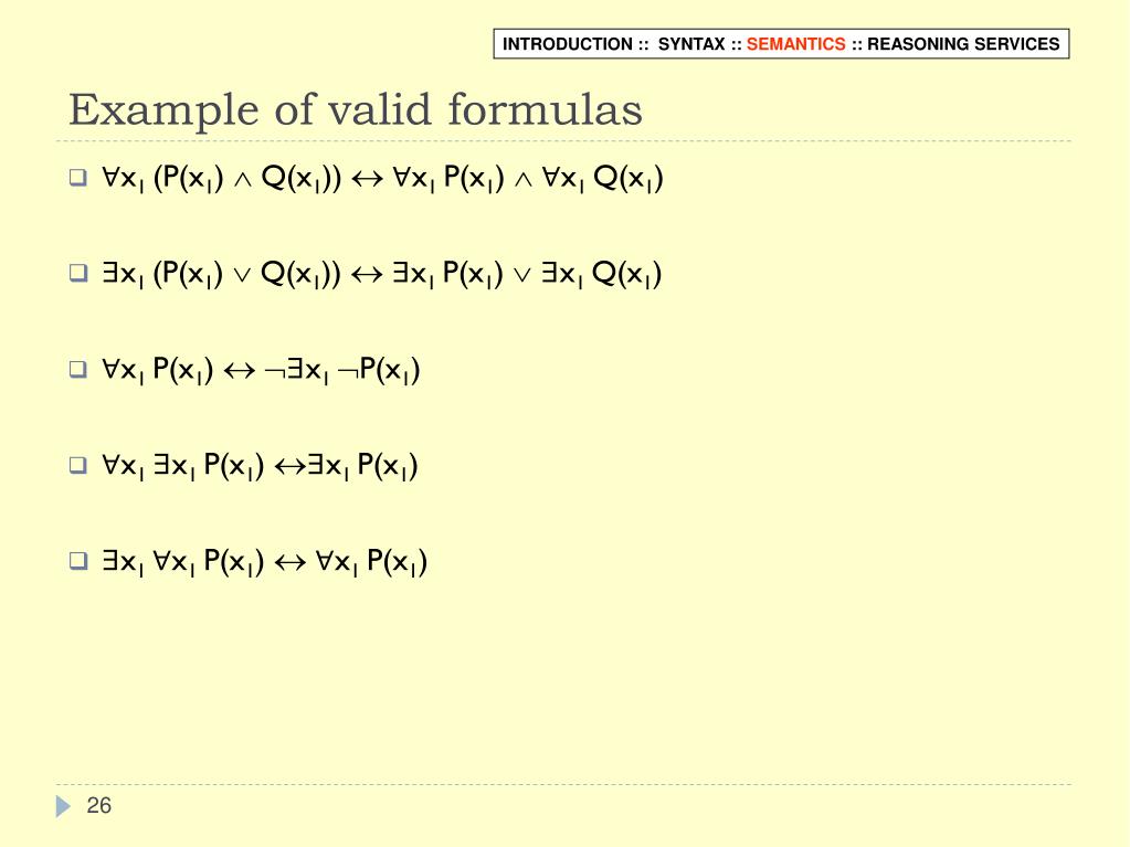 Example of valid formulas INTRODUCTION :: SYNTAX :: SEMANTICS :: REASONING SERVICES • ∀x1 (P(x1) Q(x1)) ∀x1 P(x1) ∀x1 Q(x1) • ∃x1 (P(x1) Q(x1)) ∃x1 P(x1) ∃x1 Q(x1) • ∀x1 P(x1) ∃x1 P(x1) • ∀x1 ∃x1 P(x1) ∃x1 P(x1) • ∃x1 ∀x1 P(x1) ∀x1 P(x1) 26