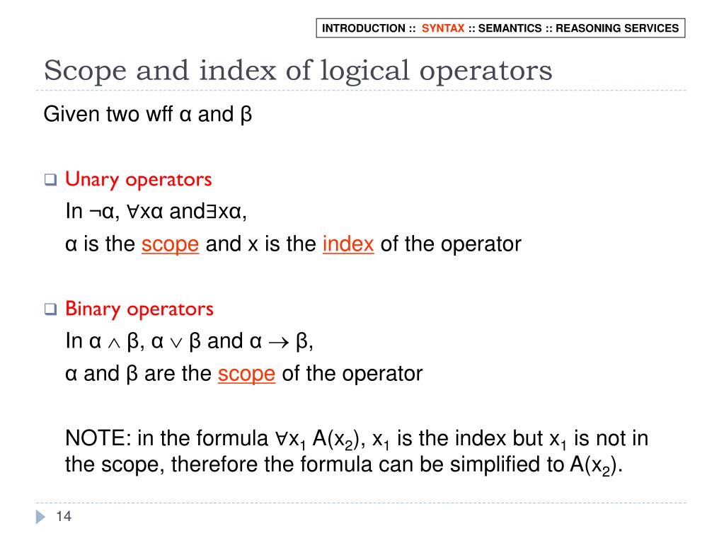 Scope and index of logical operators INTRODUCTION :: SYNTAX :: SEMANTICS :: REASONING SERVICES Given two wff α and β • Unary operators In ¬α, ∀xα and∃xα, α is the scope and x is the index of the operator • Binary operators In α β, α β and α β, α and β are the scope of the operator NOTE: in the formula ∀x1A(x2), x1 is the index but x1 is not in the scope, therefore the formula can be simplified to A(x2). 14