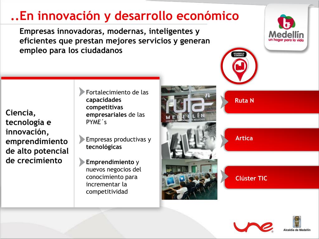 ..En innovación y desarrollo económico Empresas innovadoras, modernas, inteligentes y eficientes que prestan mejores servicios y generan empleo para los ciudadanos Fortalecimiento de las capacidades competitivas empresariales de las PYME´s Ruta N Ciencia, tecnología e innovación, emprendimiento de alto potencial de crecimiento Artica Empresas productivas y tecnológicas Emprendimiento y nuevos negocios del conocimiento para incrementar la competitividad Clúster TIC