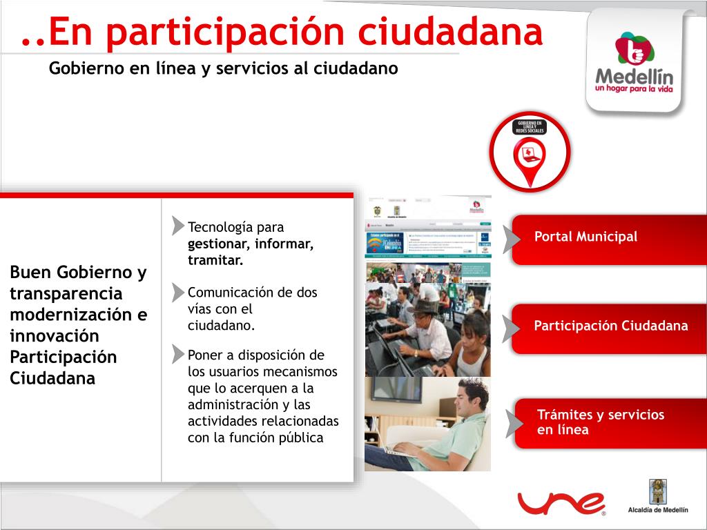 ..En participación ciudadana Gobierno en línea y servicios al ciudadano Tecnología para gestionar, informar, tramitar. Portal Municipal Buen Gobierno y transparencia modernización e innovación Participación Ciudadana Comunicación de dos vías con el ciudadano. Participación Ciudadana Poner a disposición de los usuarios mecanismos que lo acerquen a la administración y las actividades relacionadas con la función pública Trámites y servicios en línea