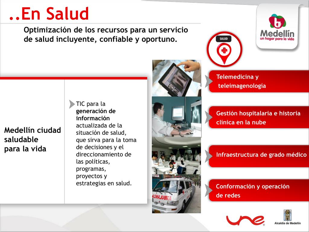 ..En Salud Optimización de los recursos para un servicio de salud incluyente, confiable y oportuno. Telemedicina y teleimagenología TIC para la generación de información actualizada de la situación de salud, que sirva para la toma de decisiones y el direccionamiento de las políticas, programas, proyectos y estrategias en salud. Gestión hospitalaria e historia clínica en la nube Medellín ciudad saludable para la vida Infraestructura de grado médico Conformación y operación de redes