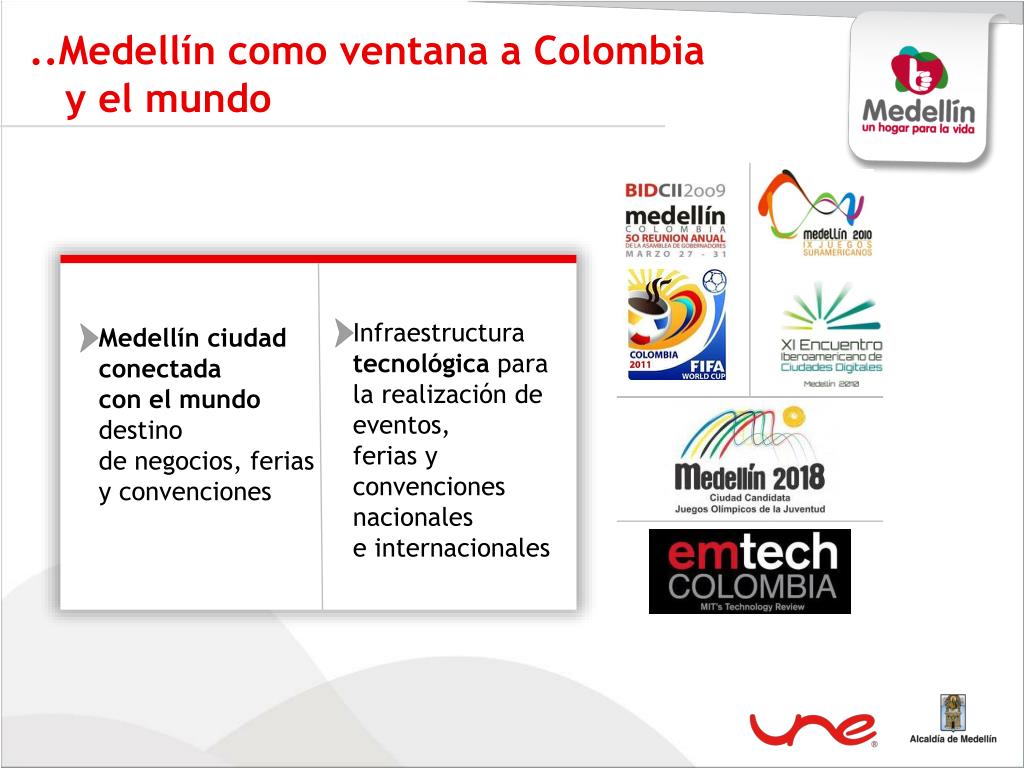 ..Medellín como ventana a Colombia y el mundo Infraestructura tecnológica para la realización de eventos, ferias y convenciones nacionales e internacionales Medellín ciudad conectada con el mundo destino de negocios, ferias y convenciones