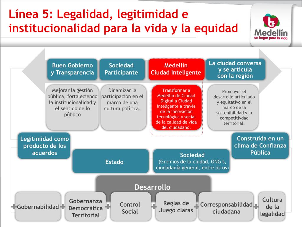 Línea 5: Legalidad, legitimidad e institucionalidad para la vida y la equidad La ciudad conversa y se articula con la región Buen Gobierno y Transparencia Sociedad Participante Medellín Ciudad Inteligente Mejorar la gestiónpública, fortaleciendo la institucionalidad y el sentido de lo público Dinamizar la participación en el marco de unaculturapolítica. Transformar a Medellín de Ciudad Digital a Ciudad Inteligente a través de la innovacióntecnológica y social de la calidad de vida del ciudadano. Promover el desarrollo articulado y equitativo en el marco de la sostenibilidad y la competitivdad territorial. Construida en un clima de ConfianzaPública Legitimidad comoproducto de los acuerdos Sociedad (Gremios de la ciudad, ONG’s, ciudadanía general, entre otros) Estado Desarrollo Cultura de la legalidad GobernanzaDemocrática Territorial Reglas de Juegoclaras Control Social Corresponsabilidadciudadana Gobernabilidad