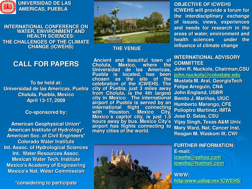 UNIVERSIDAD DE LAS AMERICAS, PUEBLA INTERNATIONAL CONFERENCE ON WATER, ENVIRONMENT AND HEALTH SCIENCES: THE CHALLENGES OF THE CLIMATE CHANGE (ICWEHS) CALL FOR PAPERS To be held at: Universidad de las Americas, Puebla Cholula, Puebla, Mexico April 13-17, 2009