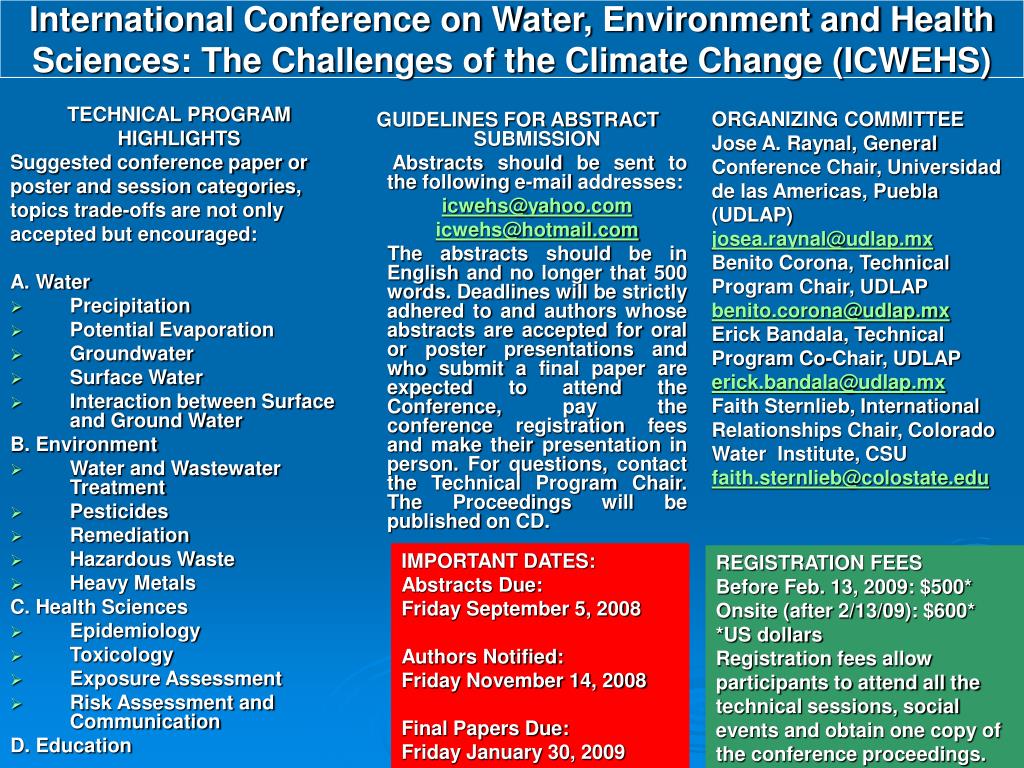 TECHNICAL PROGRAM HIGHLIGHTS Suggested conference paper or poster and session categories, topics trade-offs are not only accepted but encouraged: A. Water Precipitation Potential Evaporation Groundwater Surface Water Interaction between Surface and Ground Water B. Environment Water and Wastewater Treatment Pesticides Remediation Hazardous Waste Heavy Metals C. Health Sciences Epidemiology Toxicology Exposure Assessment Risk Assessment and Communication D. Education GUIDELINES FOR ABSTRACT SUBMISSION Abstracts should be sent to the following e-mail addresses: icwehs@yahoo.com icwehs@hotmail.com The abstracts should be in English and no longer that 500 words. Deadlines will be strictly adhered to and authors whose abstracts are accepted for oral or poster presentations and who submit a final paper are expected to attend the Conference, pay the conference registration fees and make their presentation in person. For questions, contact the Technical Program Chair. The Proceedings will be published on CD. International Conference on Water, Environment and Health Sciences: The Challenges of the Climate Change (ICWEHS) ORGANIZING COMMITTEE Jose A. Raynal, General Conference Chair, Universidad de las Americas, Puebla (UDLAP) josea.raynal@udlap.mx Benito Corona, Technical Program Chair, UDLAP benito.corona@udlap.mx Erick Bandala, Technical Program Co-Chair, UDLAP erick.bandala@udlap.mx Faith Sternlieb, International Relationships Chair, Colorado Water Institute, CSU faith.sternlieb@colostate.edu IMPORTANT DATES: Abstracts Due: Friday September 5, 2008 Authors Notified: Friday November 14, 2008 Final Papers Due: Friday January 30, 2009 REGISTRATION FEES Before Feb. 13, 2009: $500* Onsite (after 2/13/09): $600* *US dollars Registration fees allow participants to attend all the technical sessions, social events and obtain one copy of the conference proceedings.