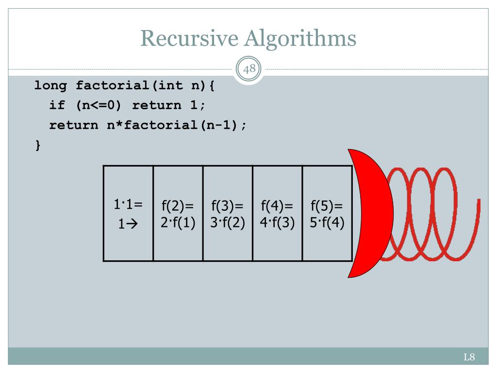Recursive Algorithms long factorial(int n){ if (n<=0) return 1; return n*factorial(n-1); }