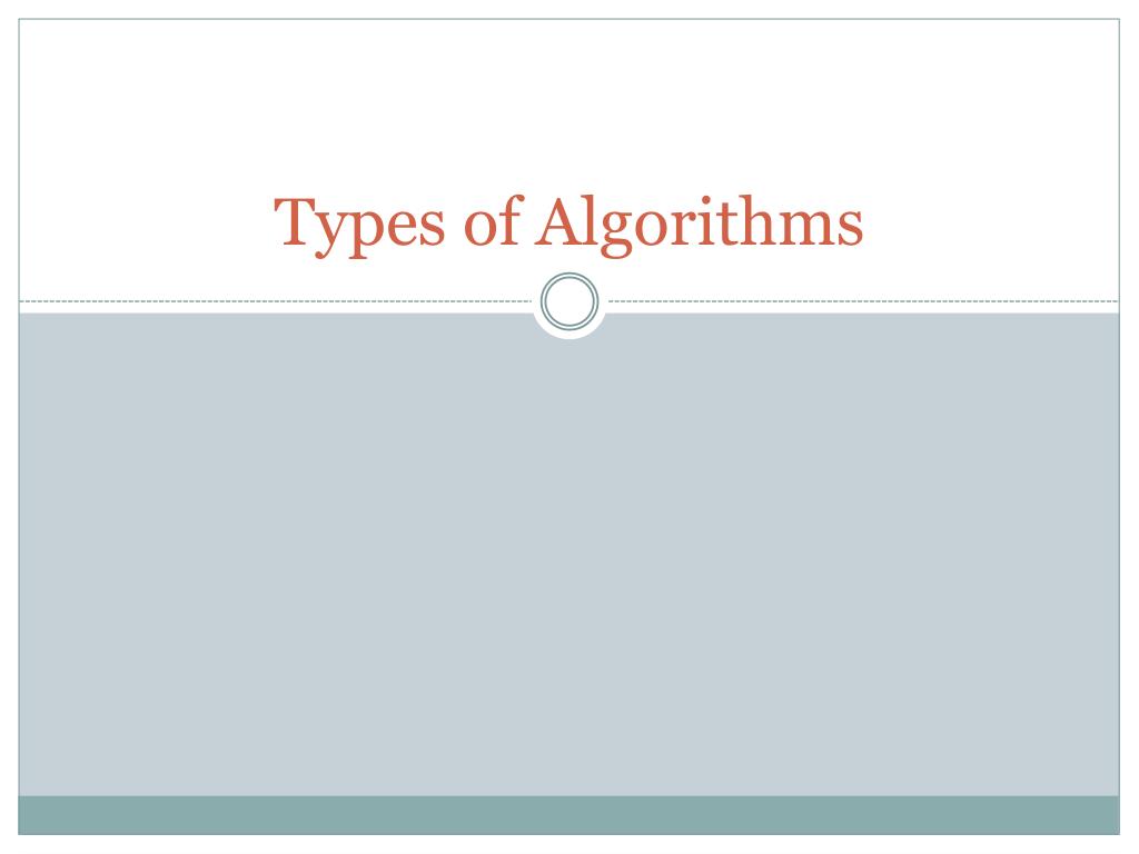 Algorithm classification • Algorithms that use a similar problem-solving approach can be grouped together • We’ll talk about a classification scheme for algorithms • This classification scheme is neither exhaustive nor disjoint • The purpose is not to be able to classify an algorithm as one type or another, but to highlight the various ways in which a problem can be attacked