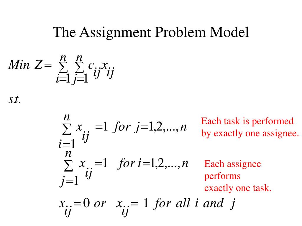 The Assignment Problem Model Each task is performed by exactly one assignee. Each assignee performs exactly one task.