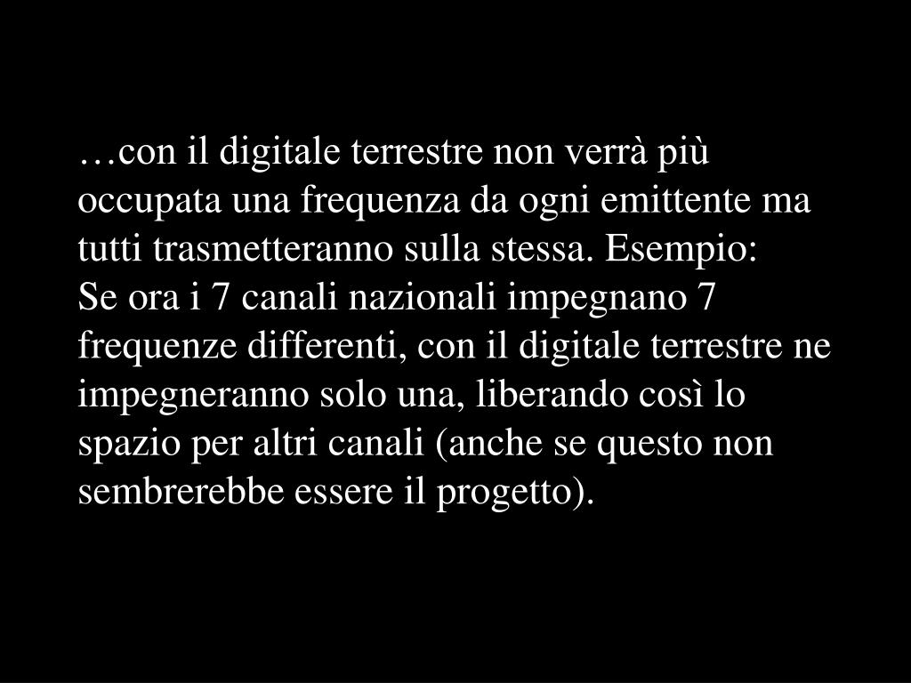 …con il digitale terrestre non verrà più occupata una frequenza da ogni emittente ma tutti trasmetteranno sulla stessa. Esempio:Se ora i 7 canali nazionali impegnano 7 frequenze differenti, con il digitale terrestre ne impegneranno solo una, liberando così lo spazio per altri canali (anche se questo non sembrerebbe essere il progetto).