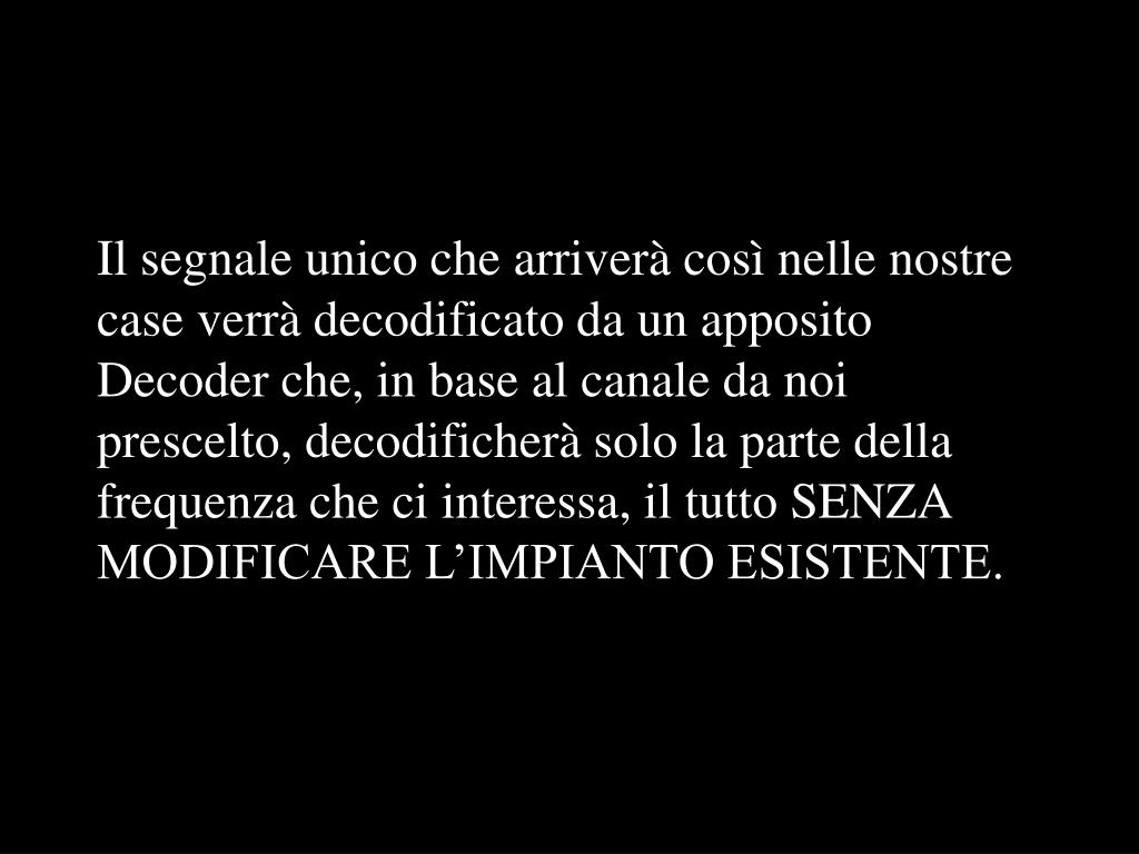 Il segnale unico che arriverà così nelle nostre case verrà decodificato da un apposito Decoder che, in base al canale da noi prescelto, decodificherà solo la parte della frequenza che ci interessa, il tutto SENZA MODIFICARE L’IMPIANTO ESISTENTE.