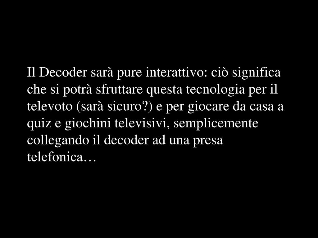 Il Decoder sarà pure interattivo: ciò significa che si potrà sfruttare questa tecnologia per il televoto (sarà sicuro?) e per giocare da casa a quiz e giochini televisivi, semplicemente collegando il decoder ad una presa telefonica…