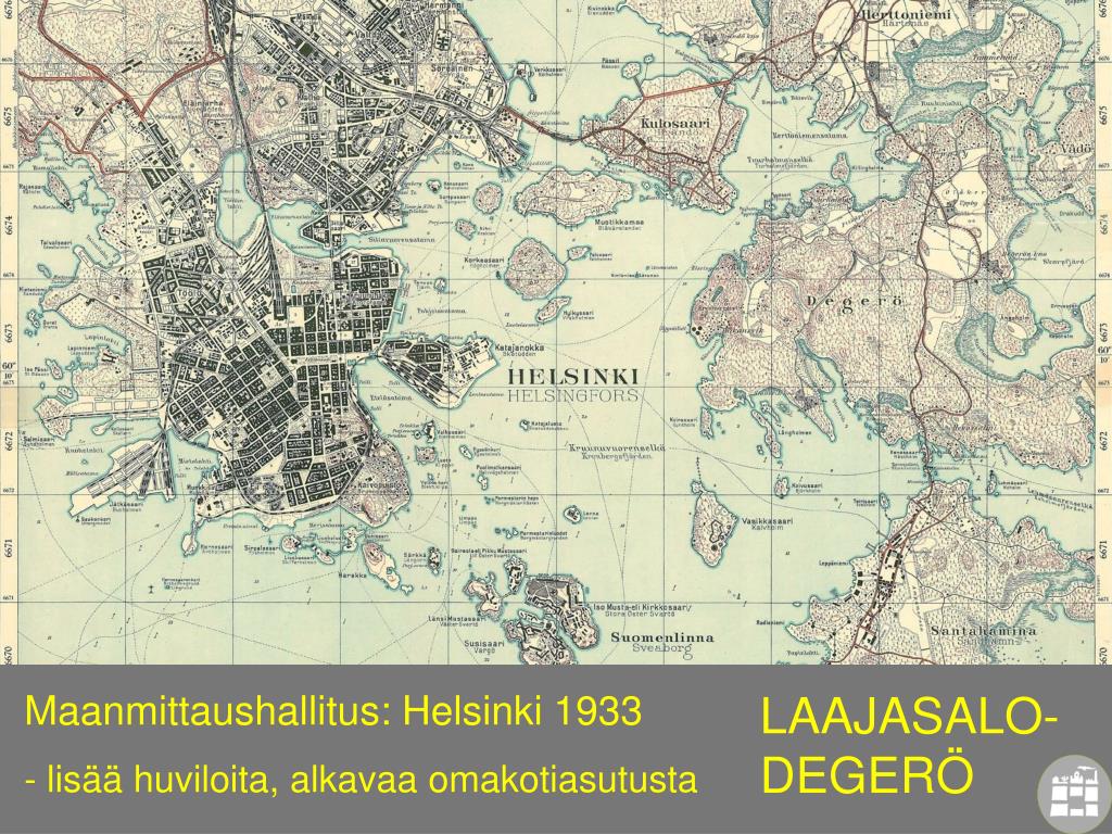 LAAJASALO-DEGERÖ. ”Senaatin kartta” vuodelta 1870 - vain kartanot ja muutama huvila. Maanmittaushallitus: Helsinki 1933 - lisää huviloita, alkavaa omakotiasutusta. LAAJASALO-DEGERÖ. LAAJASALO Alueliitos 1946 2006: 16.500 as. vähän enemmän lapsiperheitä kuin Hgissä keskimäärin