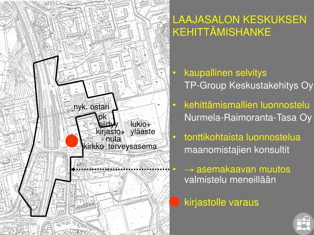 LAAJASALON KESKUKSEN KEHITTÄMISHANKE • kaupallinen selvitys TP-Group Keskustakehitys Oy • kehittämismallien luonnostelu Nurmela-Raimoranta-Tasa Oy • tonttikohtaista luonnostelua maanomistajien konsultit • → asemakaavan muutos valmistelu meneillään kirjastolle varaus nyk. ostari pk siirtyy lukio+ kirjasto+ yläaste nuta kirkko terveysasema